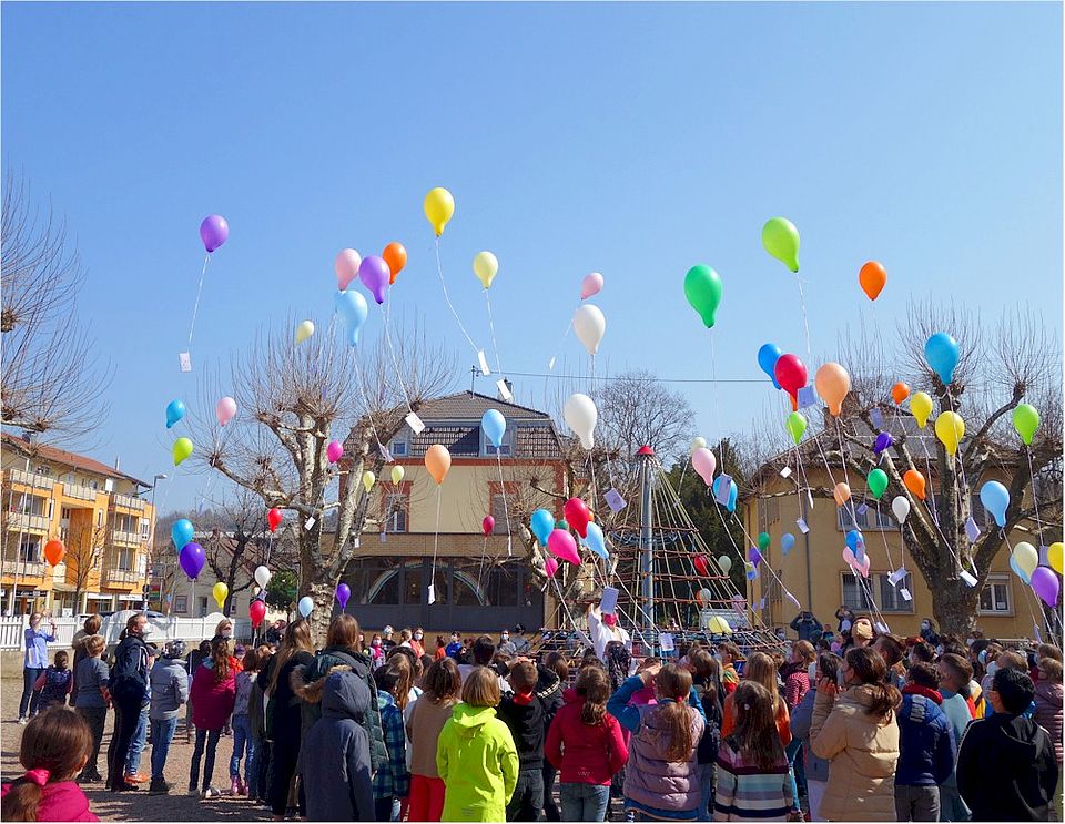 Zu dem Lied „Imagine“ von John Lennon versammelten sich die Kinder auf dem Schulhof. Nach einer Schweigeminute stiegen die Luftballons mit dem „Wind of Change“ der Scorpions in den sonnigen Frühlingshimmel hinauf. Blickte man anfangs noch in besorgte Gesichter, so zauberte der Start der Ballons einen lächelnden Ausdruck in die Kinderaugen.